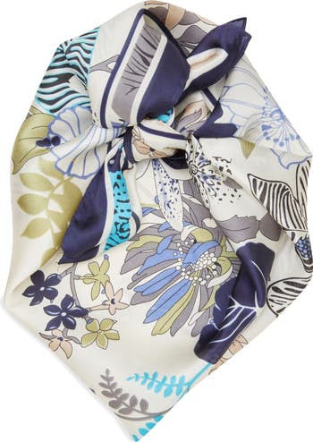 Lightweight satin and a generous square silhouette bring easy versatility to this charming scarf designed to transition seamlessly from desk to dinner.