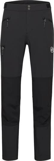 We trust the Courmayeur SO Pants when our route calls for long pushes across ridgelines, rocky steps, and weather-shifting alpine terrain. Mammut builds this mountain staple with FLEXGUARD softshell fabrics to balance abrasion resistance, breathability, and stretch, giving us the freedom to move through scrambles and steep sections without feeling restricted. The recycled double-weave nylon at the knees and lower legs adds confidence where contact with rock is unavoidable, helping these pants hold up through repeated use in rugged environments. As conditions shift, the details start to matter. The adjustable waist stays secure under a harness, and four zippered pockets keep essentials accessible without interfering with our movement. A gusseted hem with a zipper fine-tunes the fit over different footwear, while the asymmetrical leg shaping and stowable boot hook help us lock in precision when climbing in mountaineering boots. With purposeful design from hip to cuff, the Courmayeur SO Pants stay ready for the full arc of an alpine day.
