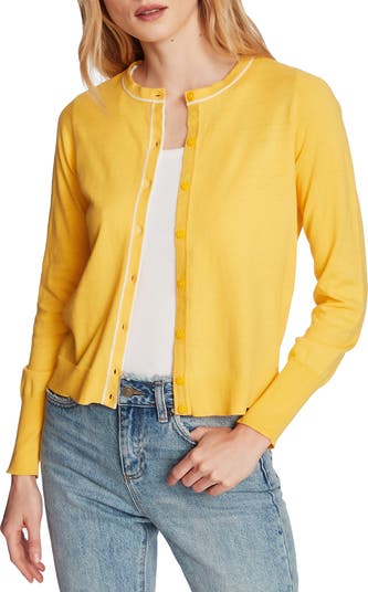 Contrast tipping delineates the placket of this cute cardi, knit from a lightweight blend of cotton and silk yarns.