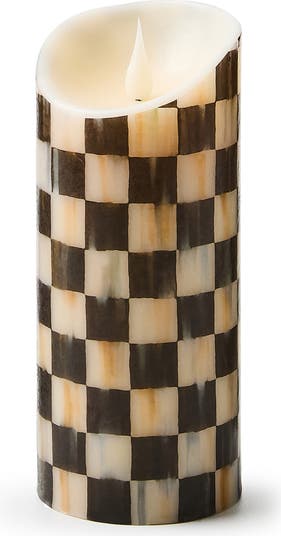 Add to ambience to every setting with this set of four flameless votive candles decorated with the brand's signature courtly check pattern. These candles have a wax exterior with a plastic center and cast a flameless glow created with two AA batteries.