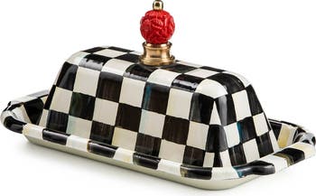 Hand-painted color-dragged checks further the retro vibes of this enameled-steel butter box covered with a glass-knob topped lid that keeps sticks fresh and ready to spread.