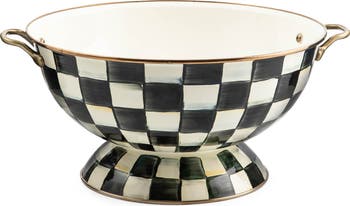 Hand-painted color-dragged checks and bronze-finished handles further the whimsical aesthetic of this enameled-steel bowl that will be a lovely addition to your tablescape.