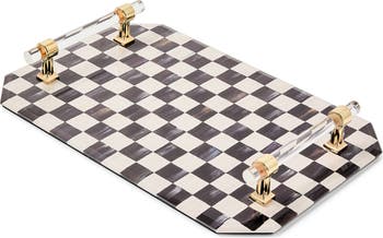 Gilt details on the acrylic handles are the perfect complementary accents to the hand-painted, color-dragged checks on this glass tray, which is a perfect organizer for the powder room, vanity, and office desk alike.