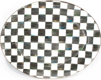 Hand-painted color-dragged checks are anything but basic on this enameled-steel platter that highlights everything you serve on it.