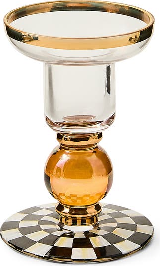 Elevate your illumination situation with the curvaceous silhouette of this glass candleholder that's hand-painted with color-dragged checks highlighted with gilt details that amplify your candle's flame.