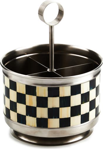 Stylishly hold flatware plus napkins in this four-compartment caddy made of stainless steel with an enamel coating featuring the maison's signature hand-painted checks.