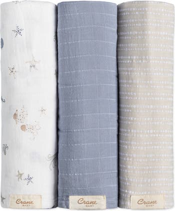Sealife patterns and subtle textures detail breathable, lightweight muslin cloths perfect for wrapping baby, as well as for use in the stroller as a burp cloth or blanket.