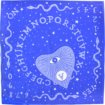 Add a mystical touch to your outfit with this celestial-inspired bandana. Featuring a vibrant blue background adorned with stars, serpents, and a classic Ouija-style planchette, this accessory blends playful intrigue with cosmic charm. Perfect for layering, tying around your neck, wrist, or bag, it’s a versatile statement piece for festival-goers, astrology enthusiasts, or anyone looking to channel a little magic into their everyday style.