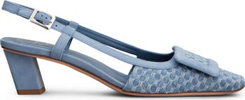 This sleek square-toe slingback pump is crafted in Italy from a textured cotton jacquard and crowned with a signature rectangular buckle covered in supple suede. It's perched on a low slanted heel for modern edge.