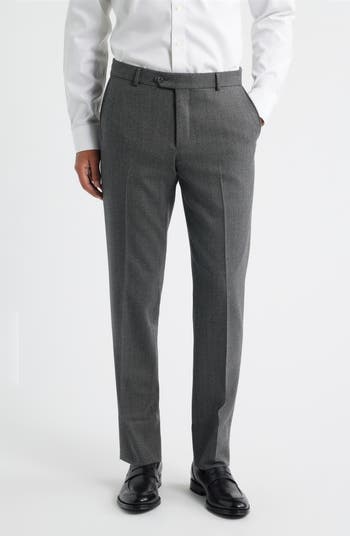 A salt-and-pepper shade lightly textures trimly tailored wool dress pants cut with a touch of shape-retaining stretch.
