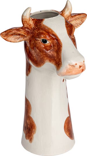 - A round stoneware vase that has a hand-painted cow design and a brown and white color scheme that adds a touch of farmhouse and country charm to any space