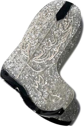 Create a rodeo-ready 'do with this handcrafted claw clip in a double-sided design that looks great from every angle. This glittery cowboy-boot-shaped clip features an extra-strong hinge for long-lasting style.