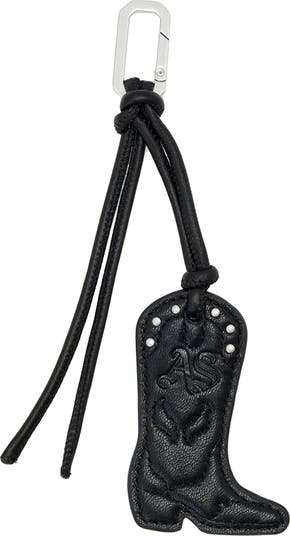 Polished studs embolden a Western-inspired boot motif that accents this leather key ring suspended from a hex-inspired clip.