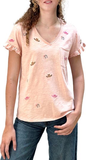 Frill-trimmed sleeves frame this V-neck T-shirt designed with Western-inspired stitching.