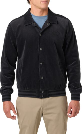 Pinwale cotton corduroy brings softness and warmth to a varsity-style jacket designed with a notched camp collar and striped ribbing around the cuffs and hem. A lightweight lining and pockets inside and out bring added functionality to the cool-weather look.