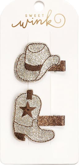 • This clip set includes: 1 silver glitter with brown embroidery cowgirl hat hair clip and 1 silver glitter with brown embroidery cowgirl boot hair clip.