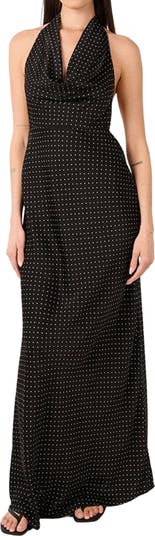 - The cowl halter maxi dress is designed in silky charmeuse fabric that hugs the body and features a draped neckline with an open back.