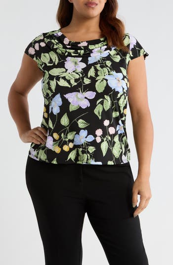A drapey neckline adds texture and dimension to this flowery stretch-kissed top framed by abbreviated sleeves.