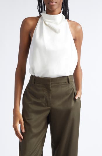 A delicately draped cowl neck crowns this billowy halter top cut from cream-colored satin in a longline silhouette.