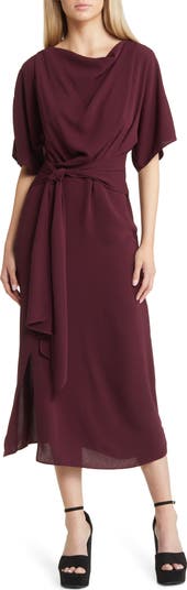 Serve up confident energy in this cowl-neck dress with a slender strap in the back, a chunky waist tie and a flowy skirt.