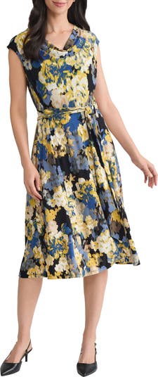 A tie belt shapes the silhouette of this soft stretch-jersey dress framed by slight sleeves and finished with a perfectly flared skirt.