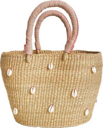 THIS ITEM IS FINAL SALE Handcrafted in Ghana, our Cowrie Bolga Tote is skillfully crafted by our female artisan partners. 16" L x 9" H x 6.5" D (5.5" Handle Drop) Natural color accented with an pink handle with pink thread Made from 100% elephant swamp grass The basket weave fabric handle is hand loomed in Burkina Faso using locally grown, organic and fair trade certified cotton Adorned with cowrie shells - treasured symbols of destiny, prosperity, and strength This summer ready handbag can be styled casually or dressed up as a unique piece that also has ample interior capacity.