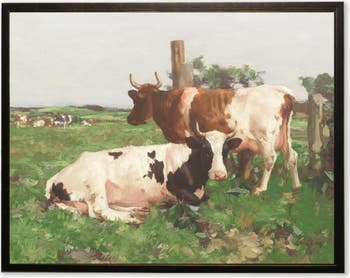 This painting-reproduction print, displayed in a copper and black frame, features two cows in a pasture. Sized at 24 inches by 18 inches, this made in the USA frame makes for a beautiful addition to any wall.