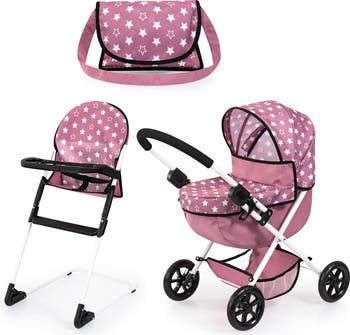 - PLAY WITH YOUR DOLLS IN STYLE: This 3pc set features a pram, highchair & sholder bag. Suitable for dolls and ups to 18". The set features a lovely pink, white, & stars design that your little ones are sure to love!