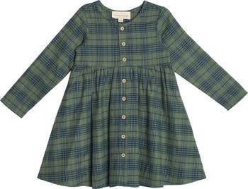 Bring the essence of autumn to your little one?s wardrobe with the Cozy Creatures Dress. This charming long-sleeve dress features a classic green plaid pattern, complemented by warm wooden button details down the front.