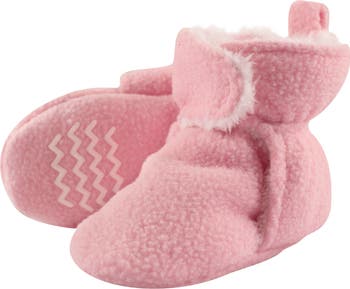 Hudson Baby fleece faux shearling booties are comfortable, cozy baby booties made with fleece/faux shearling material that will keep your little one's feet warm and comfortable. Our booties wrap around your baby's foot and fasten in the front with a velcro closure, so they are easy to put on, fasten and stay on. Our fleece/faux shearling booties feature non-skid soles to prevent your baby from slipping and falling when they start to walk and run.