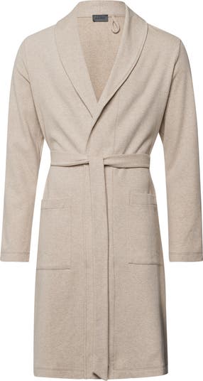 You instantly look well-groomed in a robe, both at home and on vacation. What makes this robe made from soft, brushed double-faced jersey special is the 100% sustainable material made from GMO-free organic cotton and recycled polyester. Classic design elements such as the shawl collar, sash in the same fabric and the two front pockets ensure stylish comfort all year round. With its modern style, this casual piece with real feel-good factor can also be worn outdoors
