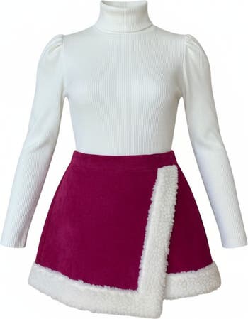 • Paired with a rich berry faux suede skort trimmed in plush ivory faux fur for a sophisticated seasonal statement