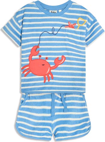 All-cotton terry cloth patterned in sky-and-clouds stripes keeps your little one anything but crabby in a T-shirt and matching shorts with a fun nautical theme. Easy to get on and off, they make playtime and down time breezy and fun.
