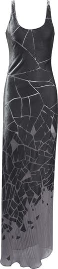 Velvety chiffon jacquard woven with a touch of silk looks like cracked plates of glass with shards falling away towards the hem on this striking maxi dress featured on the spring '26 runway. This piece designed with a deeply scooped neck is cut on the bias to enhance the body-hugging fit.