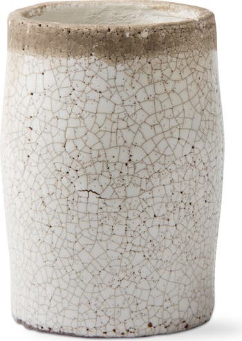 add beauty to your home with this decorative crackle glaze rustic terracotta white vase. featuring a hand applied crackle glaze finish and a rustic rim, its design accentuates the vase character and simple beauty. slight variations in color are to be expected each piece is one-of-a-kind, no two pieces will be exactly alike. as water can permeate through terracotta, display with dry plants and botanicals or on its own.