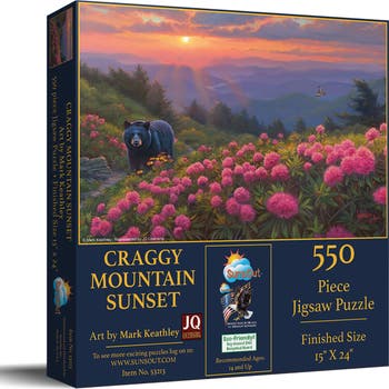 Craggy Mountain Sunset 550 pc Jigsaw Puzzle by SunsOut - 550 Piece Jigsaw Puzzle - Completed Size: 15" x 24" - Puzzle Artist: Mark Keathley - Interlocking Pieces and Durable Construction: SunsOut jigsaw puzzles feature interlocking pieces that fit securely, making assembly easier and reducing frustration. -Ages: 15 years and older - Perfect for adults and seniors. SunsOut puzzles ensure high manufacturing standards ensuring their commitment to quality and customer service. - SunsOut puzzles use soy based inks, high quality puzzle board. As this is a jigsaw puzzle: assembly is required and batteries are not required.