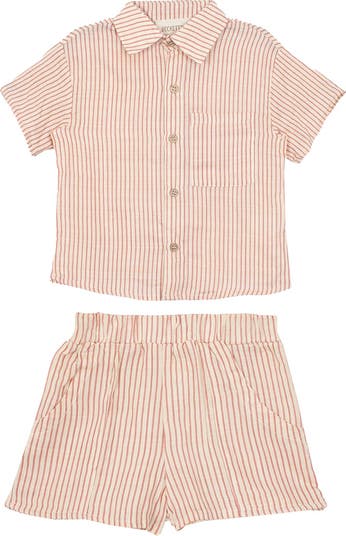 This boys' 2PC set features a red and cream striped button-up shirt with a classic collar and front pocket for a timeless look. Paired with matching elastic-waist shorts, this lightweight outfit ensures comfort and breathability. Perfect for warm-weather outings, it offers effortless style with a relaxed yet polished feel. Fabric Care 65% COTTON 35% VISCOSE Machine Wash Cold | Line Dry | Do Not Bleach