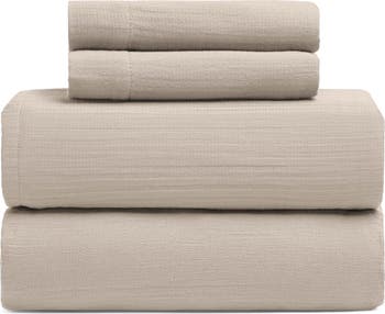 With warm-yet-neutral color and a softly crinkled texture, this relaxed cotton-gauze sheet set invites you to slow down and unwind. This set is made from pre-washed cotton that's great for any season and gets softer with every wash.