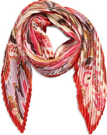 Dense micropleats add textural depth and dimension to the swirling pattern of this scarf made in an intriguing oblong-diamond shape.