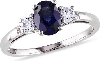 Showcase your profound promise with the striking color contrast and timeless brilliance of this three-stone ring. Crafted in radiant 10k white gold, the ring features a magnificent created blue sapphire center stone, complemented by two brilliant created white sapphire side stones. These stones symbolize your past, present, and future together. Delicate diamond accents enhance the brilliance of the band, adding a touch of sophisticated sparkle. This piece is an elegant and enduring declaration of love, delivered with captivating color and light.