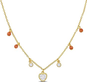 This beautiful station necklace is crafted in yellow-plated sterling silver and showcases a heart lab-created white sapphire at the center with round-cut lab-created sapphires on each side and coral beads stationed along the necklace. This necklace is 16 inches in length with a 2 inch extension and is secured with a spring ring clasp.