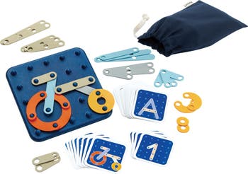 Includes: Complete with a wooden peg board, 40 double-sided play cards (26 for English uppercase and lowercase alphabets, 10 for numbers 0-9, and 4 with pictures) and 30 rubber sheets with 5 shapes and colors.