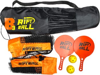 B3 Riftball game is a great new game that has two nets for twice the fun from Creative Brainworks. This "Nonstop on the Go Game" trademarked game combines our specially designed adjustable dual net game, with paddles and game ball for a fast paced competitive fun game that can be played anywhere. The exceptional innovation behind our Riftball game allows players to determine the opening and distance for a unique game play each time a paddle is picked up. Riftball gets players up, moving and for nonstop fun - to keep playing, trying to improve their skills and become a Riftball Champion. Riftball is designed with high quality metal for durability, special elastics to keep all the parts together without pieces going everywhere, and specially design dual net system to challenge all levels of players. This game is great for tailgating, camping, backyard, the beach, family reunions, college gameday, basements and more. Easy to Play: Riftball 2 net paddle ball game system is quick to set up and start enjoying this fastpaced Nonstop on the go game. This specially designed game system - combines metal construction with elastic within the poles to keeping parts together and allows for quick set up and take down. Riftball is ready to be played right out of the box with quick set up. The set comes with 1 Riftball Game system that includes the top pole, 2- game nets one for top section and one for bottom section. 2 - Riftball game paddles, 2- game balls, 1 heavy duty nylon carry bag, and set up and game play instructions. Riftball is a unique game that has a specially design adjustable dual net game system for twice the fun. Quick set up: This portable, outside or inside game sets up fast at the beach, in the backyard, for tailgating, while camping, basement or any place to have some fun.