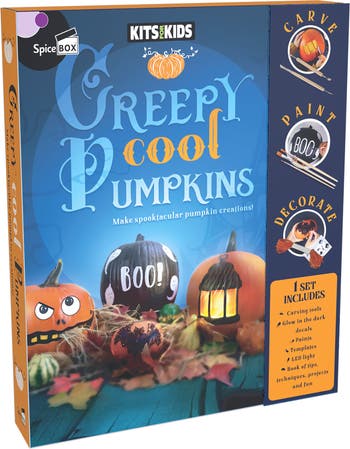 Embrace the spirit of Halloween with the SpiceBox Kits for Kids Cool Pumpkins kit! This comprehensive set provides everything kids need to create impressive jack-o'-lanterns, and even uniquely painted pumpkins without carving. The kit comes with a set of five premium kid-friendly carving and sculpting tools, two tubes of paint, a paintbrush, 10 design templates, and glow-in-the-dark decals. Also included are an LED light to illuminate your creations, and two skeins of thread to create hanging ornaments. Detailed instructions guide you through each step, making it easier than ever to become a pumpkin pro! All these are encased in a sturdy large-format box with a magnetic closure for easy storage. With the Cool Pumpkins kit, the possibilities for Halloween fun are endless!