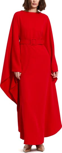 Mac Duggal Crepe Boat Neck Belt Detail Shawl Gown, Main, color, Cherry