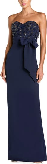 This strapless crepe gown features an embellished bustier and curve-skimming silhouette, completed by a graceful bow that adds soft, feminine sophistication.