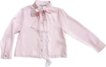 Elevate your wardrobe with our Pink Crepe Fringe Blouse! Made from luxurious pink crepe fabric, this blouse features delicate fringe tassels and charming rosebud buttons. The playful pussycat bow in front adds a touch of femininity, making it a perfect choice for any fashion-forward girl.