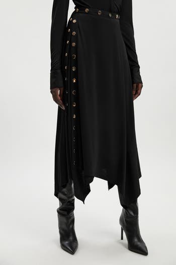 This Karen Millen maxi skirt combines sophisticated design with modern detailing for a versatile daywear piece. The distinctive hanky hem creates beautiful movement as you walk, while the eyelet embellishments add a touch of contemporary glamour to your ensemble. Style with a crisp shirt tucked in and cinch with the accompanying belt for a polished silhouette, or pair with a fitted knit and ankle boots for casual gatherings.