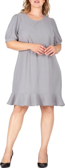 Voluminous puff sleeves and a flounce hem lend contemporary appeal to a crepe knit dress that will complement your trendsetting style.