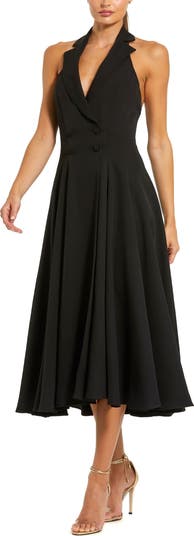 Sleeveless crepe midi dress with a blazer-style halter neckline, offering a sleek and sophisticated look. Perfect for polished occasions or chic evenings out.